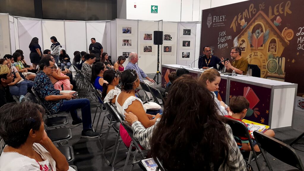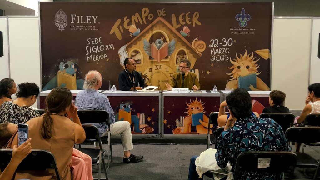 Acompañado por el artista plástico y visual Manuel May Tilán, explicó que la crisis surge cuando lo viejo no deja espacio para lo nuevo y compartió su visión sobre la educación, destacando la frase atribuida a Sócrates: “Educar no es llenar un recipiente, es encender una llama”.