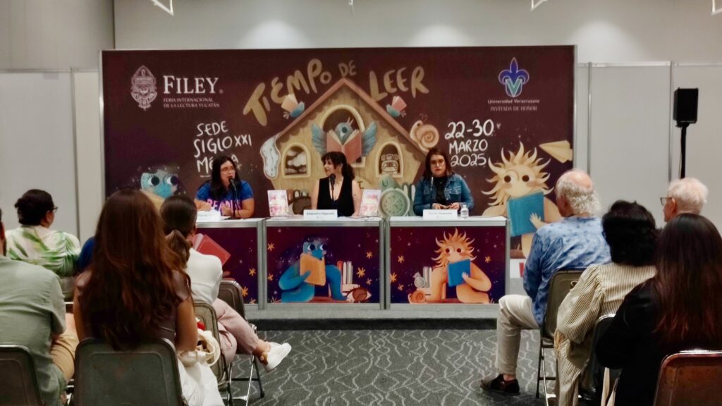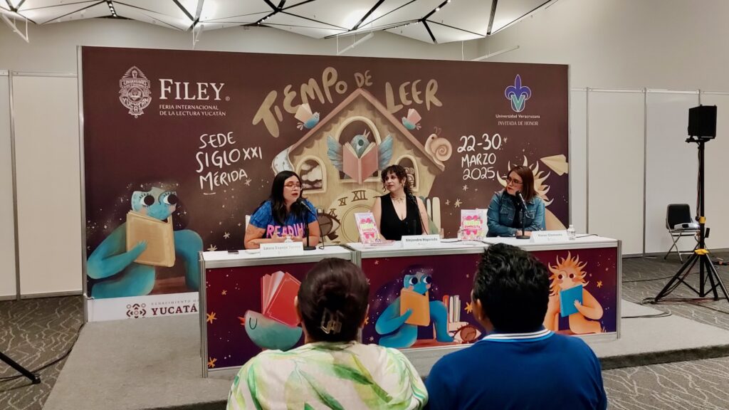 La autora y fundadora de la plataforma mediática Malvestida, Alejandra Higareda, presentó su libro Existir suavecito, en la Feria Internacional de la Lectura Yucatán (FILEY) 2025, acompañada por Laura Espejo Torres y Karen Clemente.
